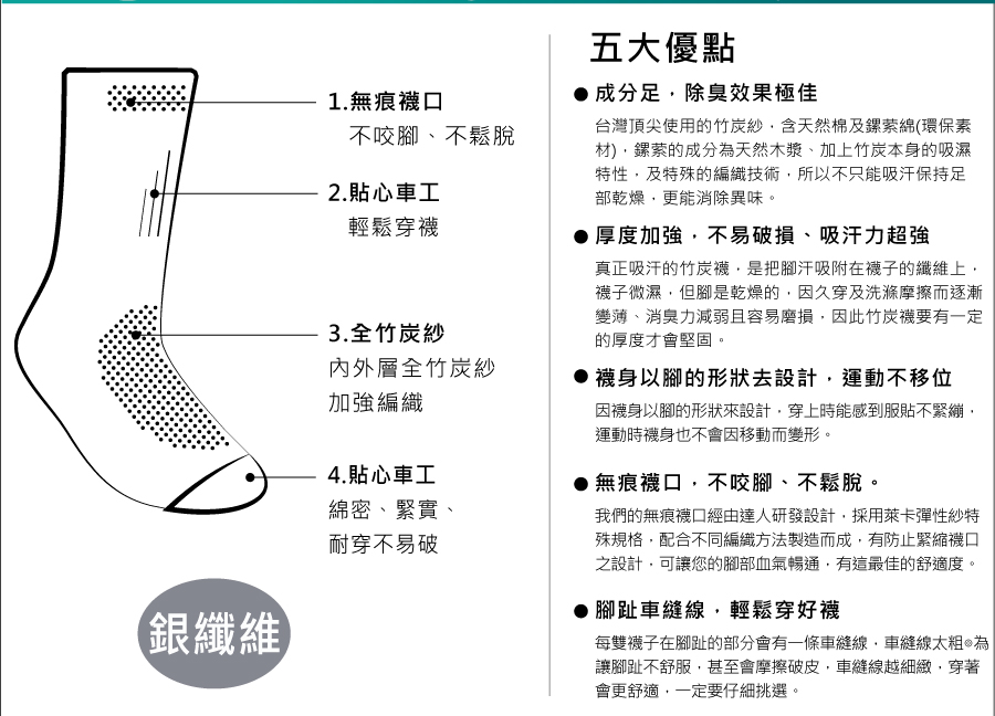 ★100%台灣製整雙採竹炭螺縈棉紗+銀纖維材質,吸濕除臭效果最佳,