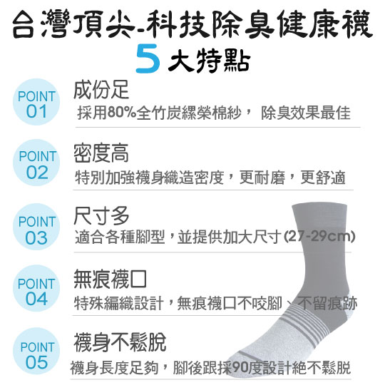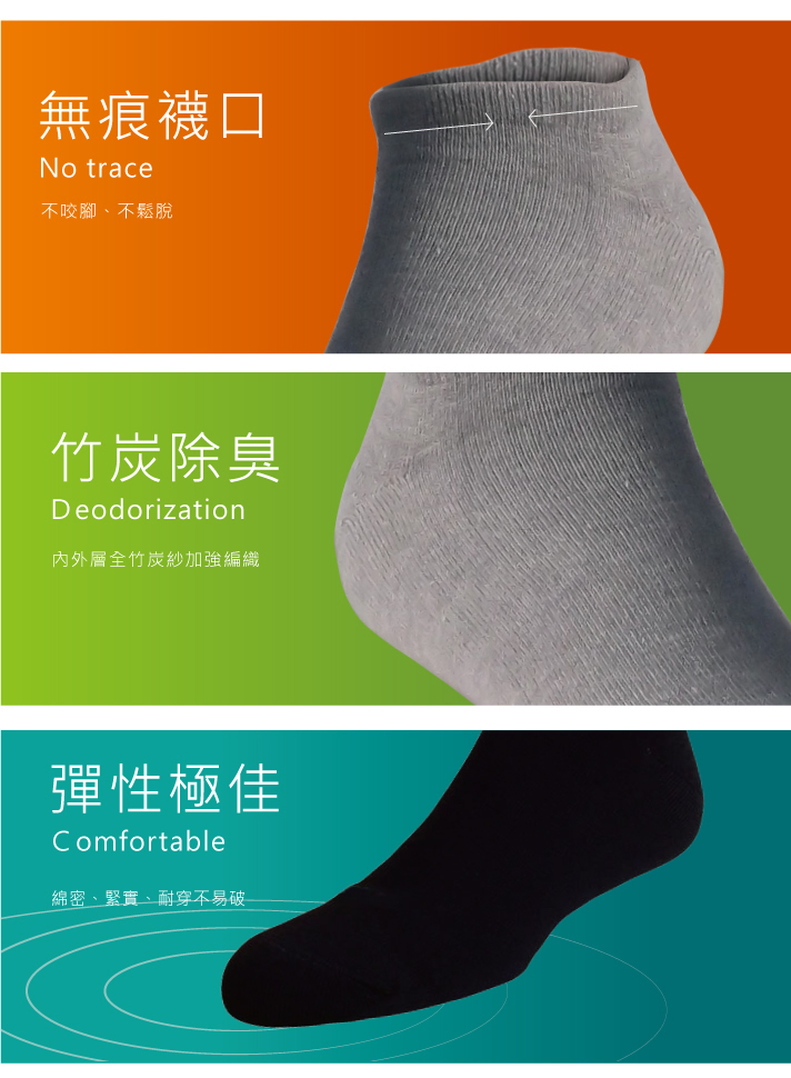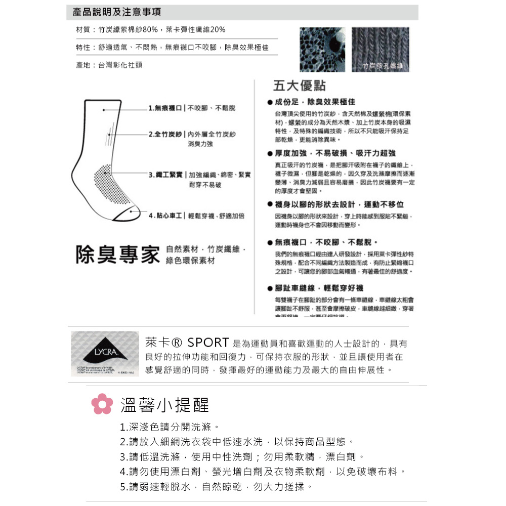 1.整雙採用最好的天然竹炭嫘縈棉,除臭吸汗效果最佳,